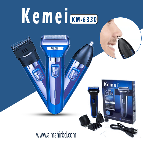 Kemei KM-6330 হলো একটি আধুনিক 3-in-1 grooming device, যা পুরুষদের চুল, দাড়ি ও নাকের অপ্রয়োজনীয় লোম সহজেই ট্রিম করতে সাহায্য করে। এটি হোম ও ট্রাভেল দুই জায়গায়ই ব্যবহারযোগ্য এবং নির্ভরযোগ্য, নিরাপদ ও আরামদায়ক।